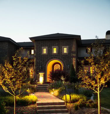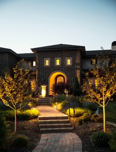 Landscape lighting highlights architectural details, gardens, and walkways, creating a warm and inviting ambiance after sunset.