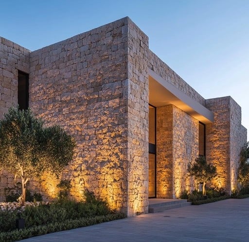 Landscape lighting highlights architectural details, gardens, and walkways, creating a warm and inviting ambiance after sunset.