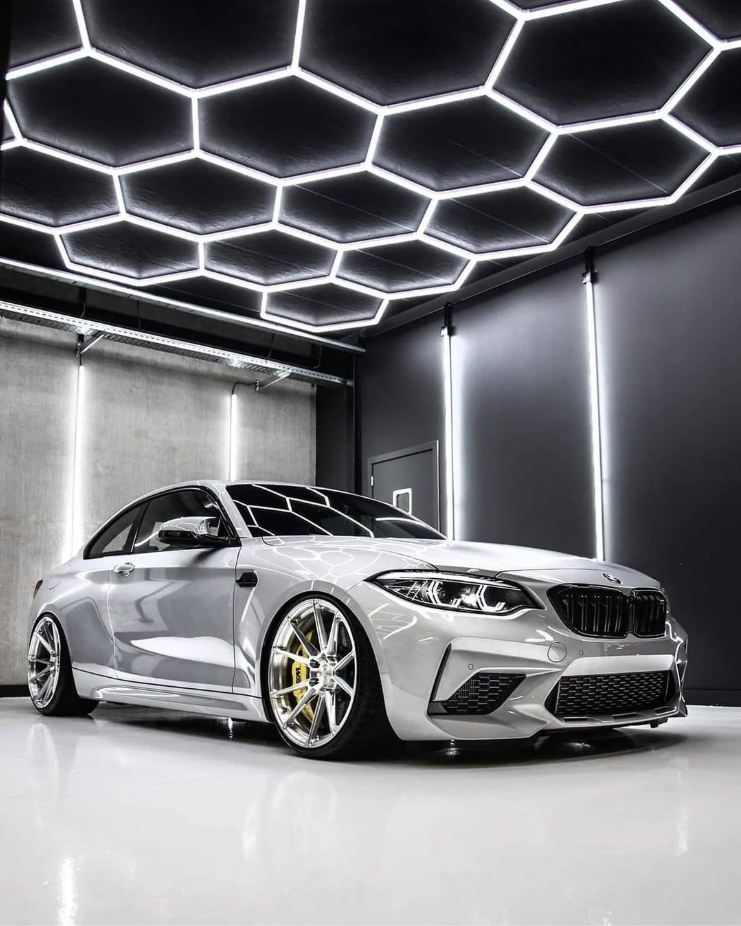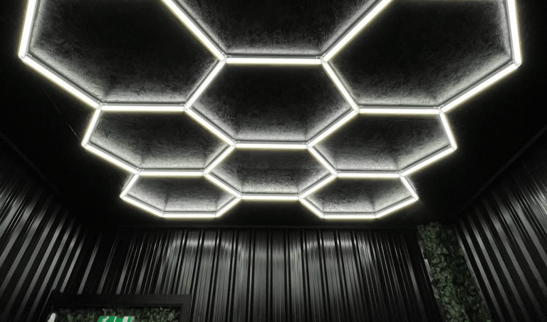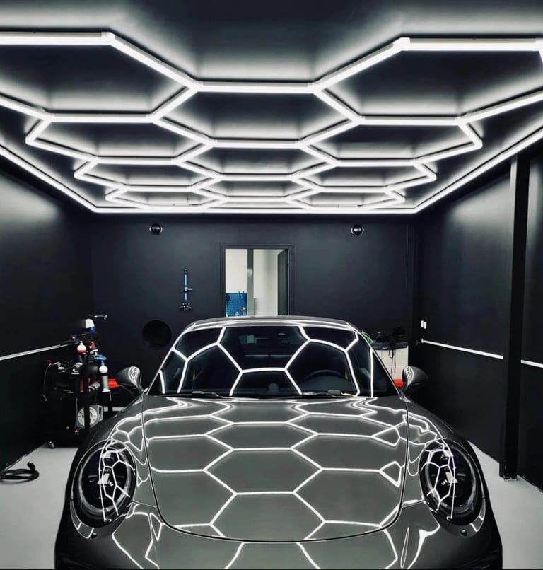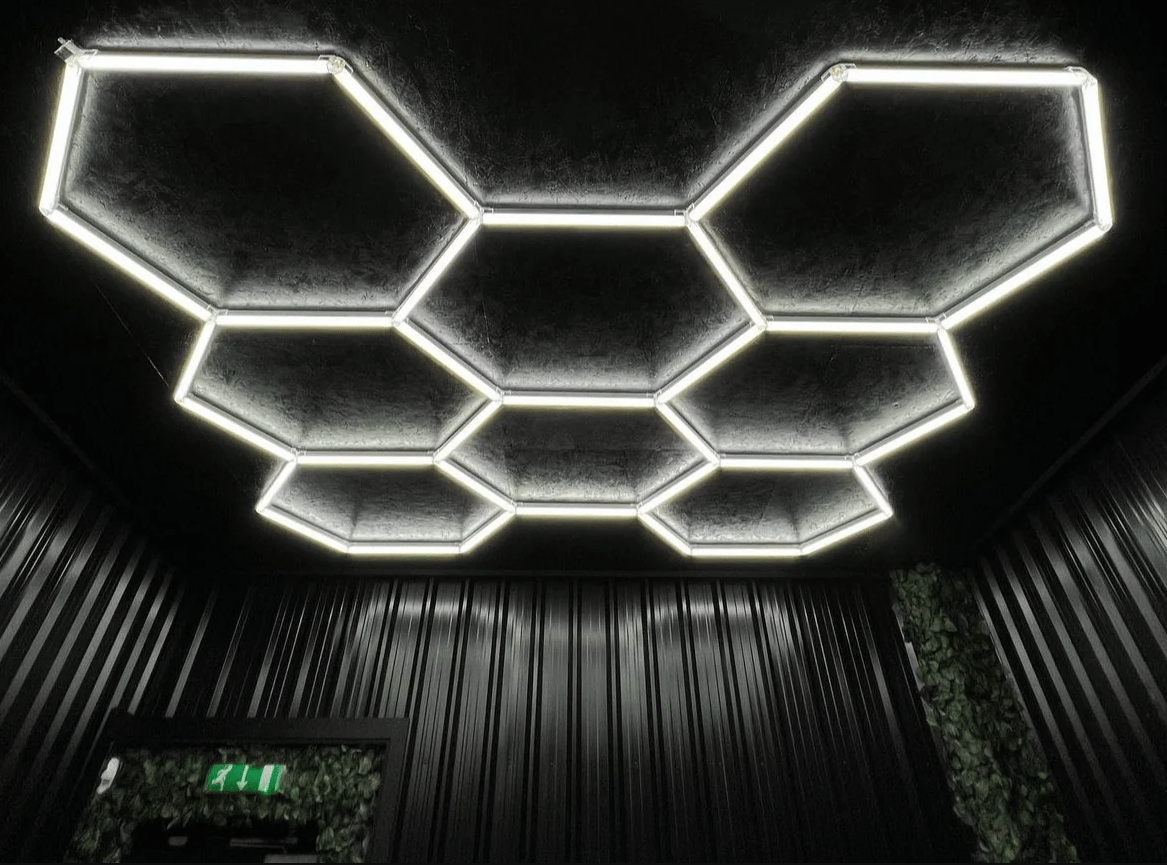 HexGlow modular hexagon ceiling lights turn garages, shops, home gyms, and studios into bright, show‑ready spaces. Nearly flush‑mount and ultra‑clean by day, brilliantly uniform by night. Exterior Lighting Solutions installs HexGlow across Cache Valley & Bear Lake.